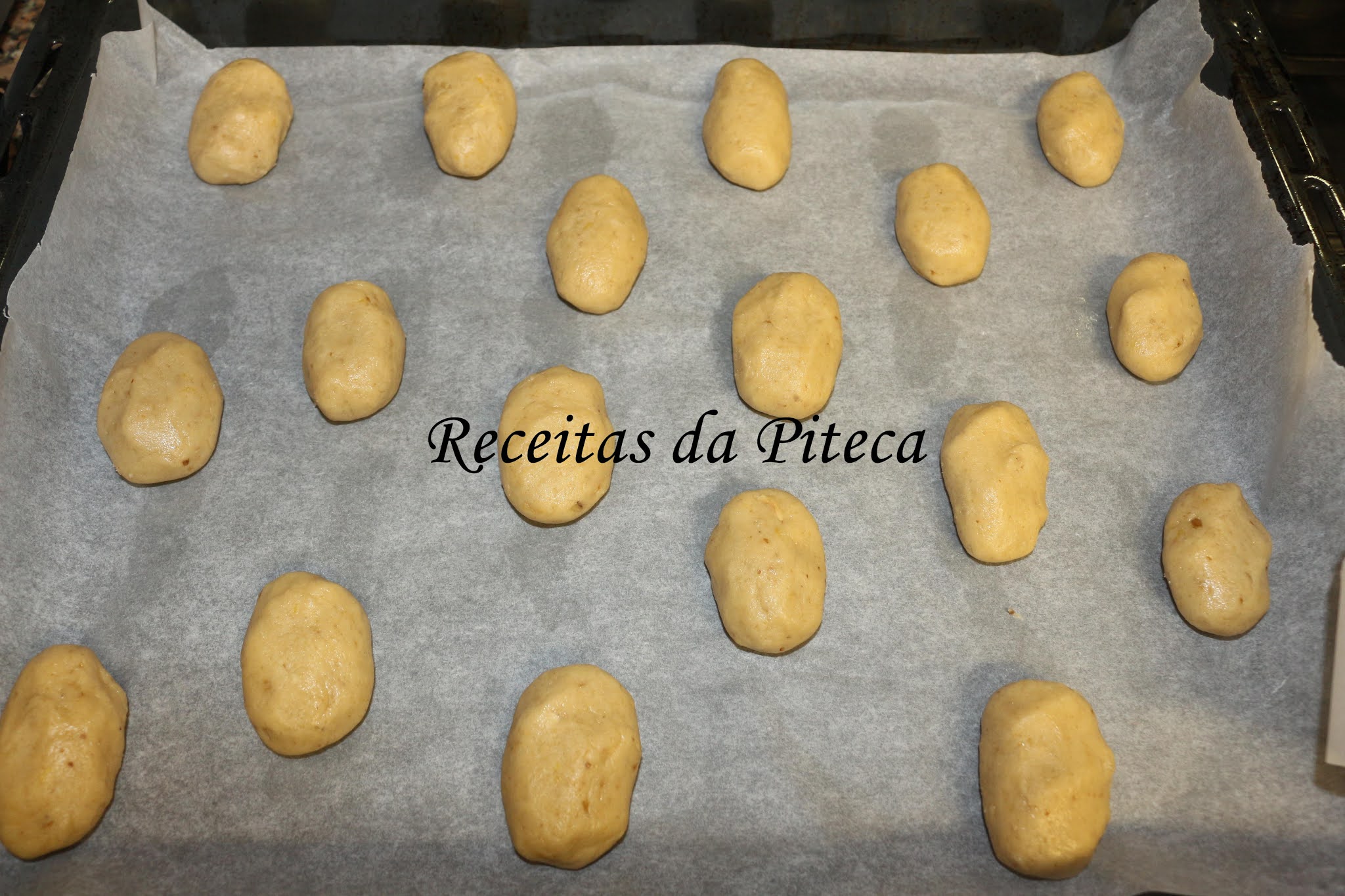 Forme bolinhas, dispondo num tabuleiro revestido com papel vegetal, tendo o cuidado de deixar um espaço entre elas.