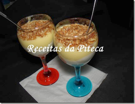 Em tacinhas (ou numa taça grande) coloque iogurte natural até meio, acabe de encher com o creme de pasteleiro e decore com os amendoins.