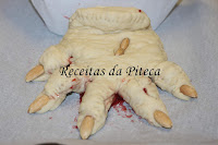Desta vez a Telma pediu para fazermos uma receita assustadora inspirada no halloween. Lá pus a cabeça a funcionar e PUM!!!! O que saiu foi uma mão de monstro super mega assustadora, de meter medo aos mais fortes, de fazer qualquer um ir ás lágrimas... ou não! Mas que ficou deliciosa lá isso ficou!! 😂