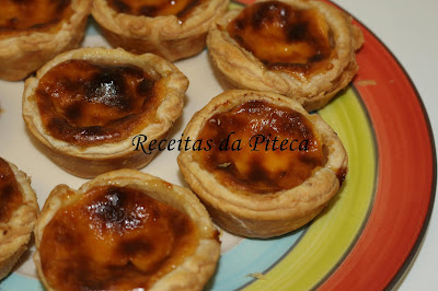 Estende-se a massa folhada até ficar com a espessura de uma moeda e com a boca de um copo vão-se cortando rodelas de massa que se vão metendo nas formas de queque (eu untei as formas com manteiga) e com o dedo polegar molhado em água pressiona-se a massa contra as paredes da forma, dando-lhe o formato da mesma.